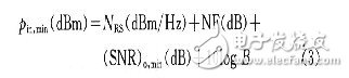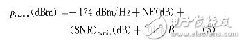 从表2的仿真结果可以看出整个接收端的增益为17.205 dB,假设接收天线接收到的信号为-30 dBm,则接收到的中频信号大小为-12.795 dBm。中频信号的仿真值略低于中频接收端所需要的信号大小,这可以用驱动放大器来增加信号的大小。另外由仿真结果可以看出接收端总的噪声系数为4.151 dB,而计算出的结果为4.12 dB。仿真的接收端的三阶输入截点为-10.124 dBm,而计算出的为-9.75 dBm。以上结果有一定的差异,该差异是由增益压缩等因素所引起的。接收机的一个很重要指标是灵敏度,它定义为:在给定的信噪比的条件下,接收机所能检测的最低输入信号电平。灵敏度与所要求的输出信号质量即输出信噪比有关,还与接收机本身的噪声大小有关。接收机的灵敏度可由下式计算得出: