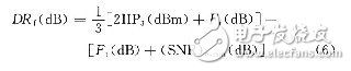 在本设计中,NF=4.12 dB,B=6 MHz,当(SNR)0,min=10 dB时,由式(5)计算可得:pin,min=92.08 dBm。接收机所接收的信号强弱是变化的,通信系统的有效性取决于它的动态范围,即高性能的工作所能承受的信号变化范围。动态范围的下限是灵敏度,上限由最大可接受的信号失真决定。在本设计中考虑的是低噪声放大器的输入端的动态范围。动态范围可由式(6)得到: