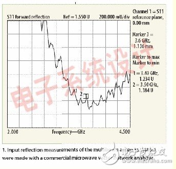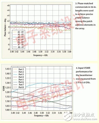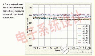为展示该设计方法,设计了一个用于3.4到3.6GHz频段的四束天线波束成型器。用安捷伦科技的N5230A矢量网络分析仪对其性能进行了测量,N5230A在工作时与同样来自安捷伦的也工作在3.4到3.6GHz范围的U3042A多口测试装置连接。图3、图4和图5显示的是基于该设计方法的典型八波束波束成型网络的结果。