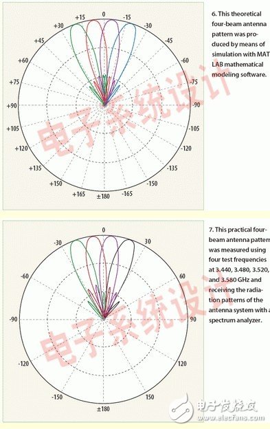 在3.4到3.6 GHz频段的开放环境对多束天线系统的辐射模式进行了测量。采用相位匹配RF电缆连接波束成型器与天线。波束成型器的输入端口接3.440、3.480、3.520和 3.580 GHz这四个不同的中心频率、每个频道的带宽是7MHz。测试所用的RF功率是+5dBm,来自天线和波束成型器的联合接收功率的测量是利用频谱分析仪在距离200m处进行的。接收到信号的功率在以200m为半径的圆周每隔1.0 deg.测量一次,其中把四束天线作为圆周中心。图7显示了该实际辐射样式。图6也给出了采用MATLAB 软件模拟得到的理论辐射样式。