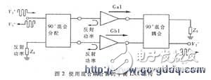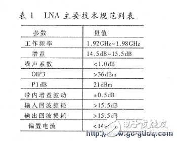 通常,在lna的设计中主要考虑低噪声系数(nf)、足够的增益(g)和绝对的稳定性。对于本文tma放大器中lna设计的实际技术规范要求如表1所示。同时要求所使用的lna结构满足良好的输入输出匹配,保证lna的稳定性,兼顾到功分/合路网络的低损耗、几何尺寸小,工作带宽内良好的相位和幅度匹配,足够的工作带宽(涵盖在1.95gHz左右),符合cDMA标准上行频率。据此选择了以平衡结构为特征的lna结构(如图2)。这种平衡结构的重要特性是:它较单阶放大器的截点高出一倍,并以标准50Ω实现输入输出匹配,在某一路硬件失效时电路的冗余设计可保证系统的正常运行。但通常增益减少6db。