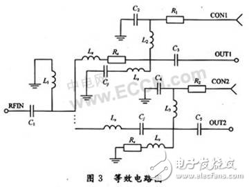 在SP4T中,四个通道完全一致,图2中只画出了第一、第二个通道。其中:R1,R2为直流偏置电阻,保证PIN管工作于适当的正偏电流;C1,C3,C5为隔直电容;L2,L3为射频扼流电感,它们与C2,C3一起构成一个低通网络,以阻止射频信号进入电源;CON1和CON2为开关选择控制信号,输入为+5 V,-5 V方波信号。当CON1为-5 V,CON2为+5 V时,D1和D4导通,D2和D3截止,通道一打开,通道二到通道四关闭。导通时的PIN管等效为一很小的串联电阻R3,截止的PIN管等效为一电阻Rr和电容Cj的串联,所以通道一打开,其余通道关闭时的等效电路如图3所示。