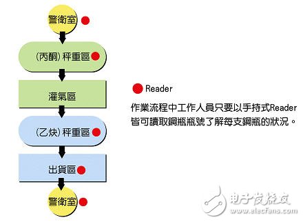 从钢瓶进厂>秤重区等待秤重>确认丙酮容量>补充丙酮再秤重>确认丙酮容量才能灌充乙炔气体>灌气完成之后再秤重>等待出货清点钢瓶数量>钢瓶出厂,作业流程中工作人员只要以手持式Reader读取钢瓶瓶号皆可以得知每支钢瓶的状况。