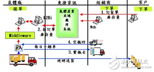 气体厂将钢瓶送达至直销客户时,先将送货通知传给客户,等到货车到达客户端时,以RFID Reader读取钢瓶资讯,回厂到货时将资讯上传至系统进行追踪认可;经销商则派货车载送空瓶给气体厂,经过自动点收后,更新经销商在气体厂钢瓶库存数量,并回传空瓶数量至经销商处,货车将钢瓶充完气的实瓶运回时,气体厂经过自动点收后,将再一次更新钢瓶库存数量及传送实瓶数量于经销商处,待货车到达经销商处卸货时,经销商则以RFID Reader读取钢瓶资料,并确认回覆气体厂商。