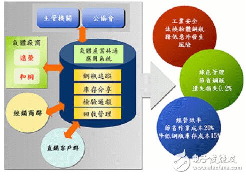 经销商可随时查询存放于气体厂的钢瓶库存量及气体厂本身自有钢瓶的库存量,此时经销商可视气体厂自有钢瓶为共用库存,经销商因应客户变动性需求,可以弹性调拨自有钢瓶或气体厂钢瓶,有助于以较少的自有钢瓶数量,满足客户需求,达到营业额提升且可同时降低经营成本之综效。气体厂则透过e化库存、RFID钢瓶进出自动点收及盘点作业,以有效管理自有及经销商所寄存之钢瓶数量;同时气体厂透过e化快速集中订货资讯,可推动巡回送货模式,降低运输成本。直销客户则可随时查询气体厂钢瓶库存状况,并透过e化订货,提升采购管理作业效率。