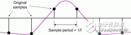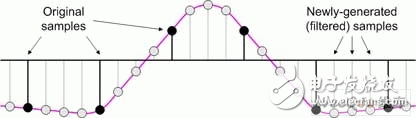 但现在有一个问题,因为新的零值样品添加了不要的频谱分量至信号。为了解决此问题,我们对这个新的信号进行了滤波,除去了不想要的分量,产生了更合适的采样值,如图6所示。