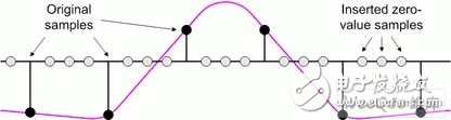 现在假设我们要增加采样率为原来频率的4倍。我们开始在原始样本之间插入零值样本,以提高采样率,如图5所示。