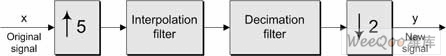 例如,如果用2.5因子进行重采样,首先我们用插值因子为5 ,然后用抽取因子2产生输出对输入采样率为5/2 = 2.5的采样率,如图8所示。