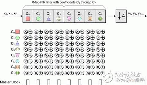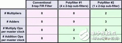 然而,对于传统的8位FIR滤波器,在每个时钟都要执行8次乘和8次加。相比最初的多相实现的情况,在任何主时钟时刻,只有一个子滤波器是工作的。由于在这个例子中每个子滤波器含有两个抽头,这意味着这个功能的滤波器部分在每个时钟只进行两次乘法和两次加法。