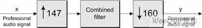 看看另一种方法,采样速率必须由48,000Hz改变到44100Hz,这意味着输入输出比为44100/48,000 = = 441 / 480 = 147 / 160。由于在147和160中没有公共的因子,我们只好就此止步,这意味着我们需要的内插因子为147 ,然后抽取因子为160,如图9所示。