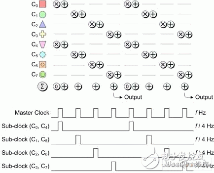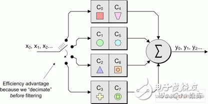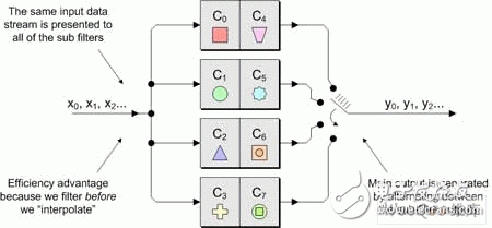 假设同样的主时钟以f Hz的频率运行,我们可以想象输入数据流被送入一个旋转开关(当然,这可用标准的逻辑技术来实现)。第一个数据值送入第一个子滤波器;第二个数据值送入第二个子滤波器;第三个数据值送入第三个子滤波器;第四个数据值送入第四个子滤波器。然后,我们进行“循环”操作,以便第五个数据值送入第一个子滤波器;第六个数据值送入第二个子滤波器;等等。
