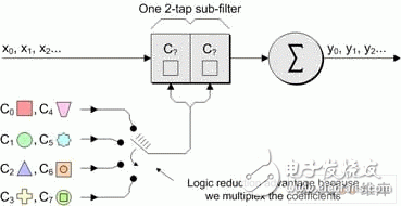 在这种情况下,我们采用了单一的2抽头子滤波器,每个抽头含有乘法器和加法器。在每个主时钟,我们选择合适的系数对。每一个抽头需要额外的寄存器和用于维护的逻辑,但与减少的乘法器和加法器相比,与我们的最初多相实现相比,这是微不足道的。