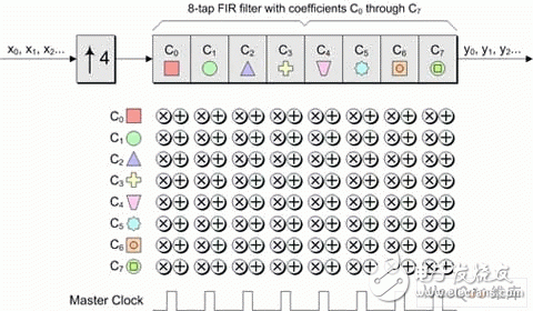 在这种情况下,相同的输入数据流面向所有的四个子滤波器,在子滤波器输出之间轮流产生主输出数据流。最终的结果是,多相实现含有如同我们的常规8抽头FIR滤波器相同数量的乘法器和加法器。然而,因为在内插之前进行了滤波,子滤波器只需要以1 / 4的主时钟频率运行,从而大大节省了功耗(这里主时钟用于子滤波器输出之间的采样)。