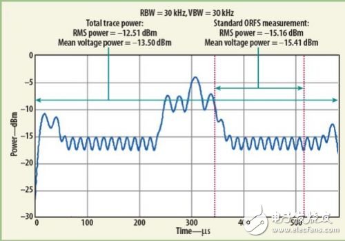 由于两种仪器输出的平均值的差别不大,所以很难看出其中一种仪器用的是公式2,而另一种用的是公式3。有必要从两种仪器分别取出多组轨迹,进行平均直到找到吻合之处。在图1的例子中,采用“真正的均方根”平均功率算法(后面简称RMS功率)的仪器,和采用“电压平均”功率的仪器之间的结果相差 0.25dB(前者比后者高0.25dB)。这点差异可能会被简单的认为是仪器之间的个体差异。尽管0.25dB看起来很小,但是当要求的精度仅仅是±1dB时,0.25dB就显得有点大了。如果是测量整个脉冲的平均功率的话(调制谱测量的是脉冲50%到90%时间内的功率),这个差异会扩大到约 1dB。这个值就会接近我们所要求的仪器之间误差容限了。