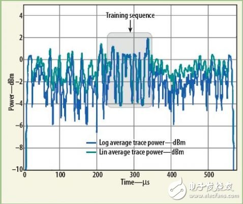 当被测信号不是重复的结果如何呢?图2就是对20个不同的EDGE信号,分别采用对数平均和线性平均后的结果。当然两条曲线会有差异,而且可以看出对数平均的结果比线性的小。图3显示的是两条曲线每一个点的差异。注意,正如我们所料,训练序列(译者注:用于同步和信道估计的部分,是完全重复的)部分的轨迹完全重合。