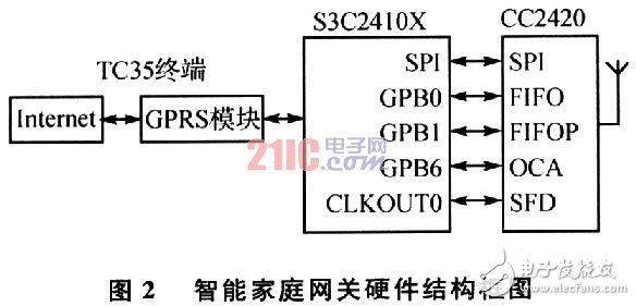 主控制器CPU控制各种各样的接口,包括以太网接口、USB接口、ADSL接口、WLAN接口等。主控制器采用三星公司的ARM9微处理器S3C24-10X,它具有外围扩展功能模块,能够实现高速处理。GPRS模块采用Siemens公司的TC35终端,通过串口与CPU相连,实现与Internet。的连接。ZigBee射频收发模块采用Chipcon AS公司的CC2420芯片.控制家庭网内具备ZigBee标准接口的家用电器。在家电控制器上加载ZigBee无线通信模块成为家庭分布式网络的终端设备。