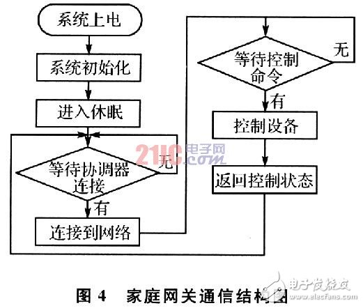 ZigBee技术是一种新兴的远距离、低复杂度、低功耗、低数据速率、低成本的双向无线通信技术。ZigBee技术的低数据速率特点,适合于承载数据流量较小和QoS的要求不高的业务,因此,ZigBee技术是最适合智能家居系统的组网技术。对于智能家居系统来说,该网络自身是一个动态系统,不断与外界环境相互影响,网络中传输的数据量不大,网络节点多,要求低功耗,因此家庭无线网关利用ZigBee技术,其拓扑结构采用星型结构组网。