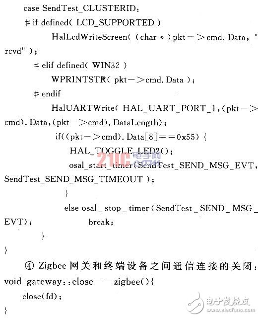 在家庭网关硬件平台的ZigBee适配器与终端设备之间建立的无线通信连接,是基于无线替代有线而建立的无线信道连接,它与实际的串行连接并没有太大的差别。这样,在Linux下利用先前移植的ZigBee工具包,完成家庭网关硬件平台上无线适配器与终端设备之间的配对与连接后,就可以以操作设备文件的方式对这条无线信道的串行连接进行操作,在本地实现对终端设备的通信和控制。主要包括两个方面的内容:一个是网关发送的控制指令要通过ZigBee发送到终端设备,另一个是终端设备反馈给家庭网关的状态数据也要通过ZigBee的方式发送给家庭网关。通信过程的结构框图如图4所示。