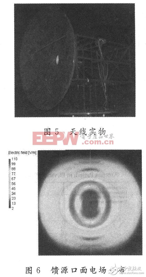如图5所示是近场卡塞格伦天线实物。该天线在微波暗室进行测量。由图6可以看出,介质透镜外表面的最大电场小于110 V/m,当输入功率为600 mW时,满足式(5),因此该馈源的功率容量大于600 mW。