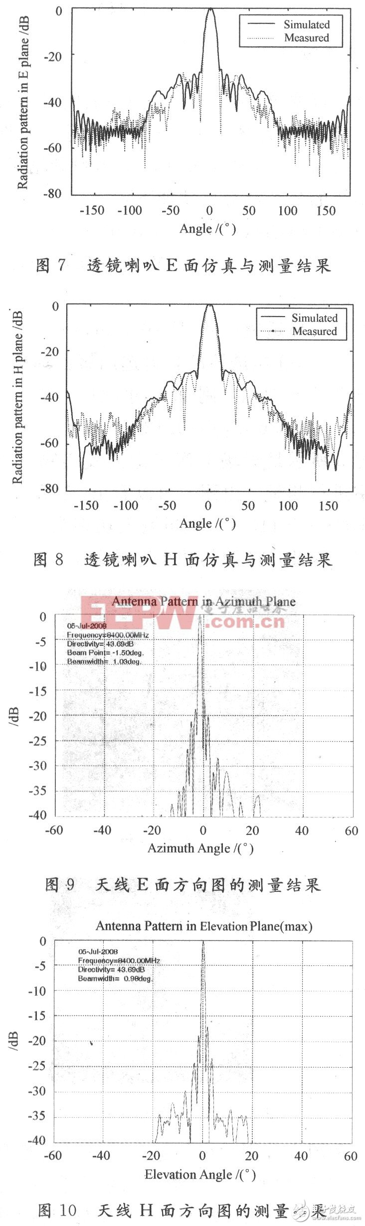 图7和图8分别示出加载介质透镜的指数型多模喇叭E面和H面的仿真结果和测量结果。通过对比可以看出,实测结果与仿真结果吻合良好,说明馈源设计符合要求。