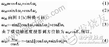 分析横倾轴的扰动(式(3))和方位轴的扰动(式(4)),无法用一只陀螺直接测量到,可用间接的方法获得。用2只陀螺分别测量cosAωy+s- inAωp和ωh,根据俯仰角E用数学的方法得到式(3)和式(4)。这样,测量ωh分量的速率陀螺安装在方位底座(不随方位轴转动),其敏感轴与方位轴平行,输出主要为船体的航向速率信息。测量cosAωy+sinAωp分量的速率陀螺安装在方位转盘上(随方位轴转动),其敏感轴与横倾轴平行。