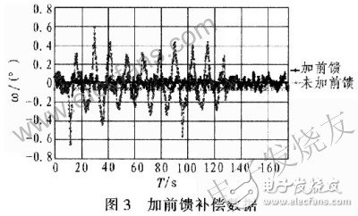 船摇扰动是作为一种干扰信号引入伺服系统,稳定控制的原理就是检测这种干扰,采取闭环或开环方式降低或消除其影响。扰动隔离方法主要有:速率陀螺前馈补偿、速率陀螺反馈控制、复合控制等方法。由于陀螺闭环控制本质上是误差调整方式。陀螺测量出的是综合扰动信息,无法区分扰动信息分量和随动信息分量。所以陀螺环路在对扰动信息进行抑制的同时,也对天线的主动运动进行动态抑制,降低了系统的响应速度,同时使系统的稳定性变差。相对而言,前馈补偿是开环调整方式,测量出的就是扰动信息,把此信息加入速度环的输入端,使天线轴以与船摇相反的速度转动,起到补偿作用。同时,由于不改变跟踪环路的结构和参数,使系统的带宽不受影响、环路的稳定性好。