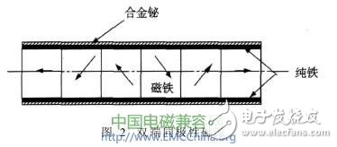 终要回到S极,也就是说激磁波飞行不久要返回原处,但是,如果使磁源形成单极性磁源,则撞击时就可使磁力线飞行到无穷远处。图2给出了形成双端同极性磁源的方法。基于这一原理将图1中2线圈形成磁单极结构,激励电流产生的磁场方向相向。