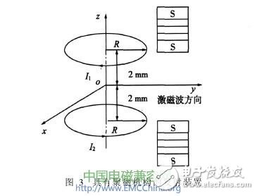同性极磁场撞击时激发生成波是一种磁性波,激磁波是以图1所示的2线圈施加脉冲电流产生的,要求脉冲电流的上升沿极陡,2线圈电流同步,保证磁场在峰点相撞。同时要求线圈产生的磁场
