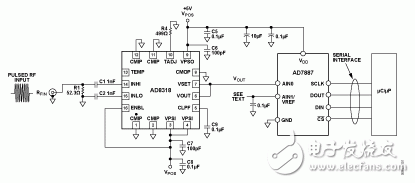 AD8318的输出直接连到12位ADC AD7887。该ADC使用自己的内部基准电压源,输入范围配置为0 V至2.5 V,因此LSB大小为610 μV。当RF检波器提供标称值−24 mV/dB的斜率时,数字分辨率为39.3 LSB/dB。由于分辨率如此高,因此调整来自RF检波器的0.5 V至2.1 V信号,以便恰好符合ADC的0 V至2.5 V范围并无多大意义。