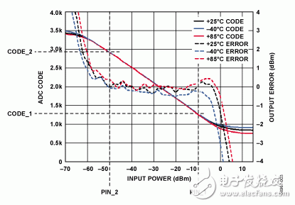 其中,SLOPE_ADC为码数/dBm,PIN 和Intercept 均用dBm表示。图3以输入功率与所观察到的ADC码的关系显示典型的检波器功率扫描情况。