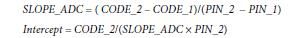 利用两个已知输入功率水平(PIN_1和PIN_2)及所观察到的对应ADC码(CODE_1和CODE_2),便可以通过下式计算SLOPE_ADC和Intercept: