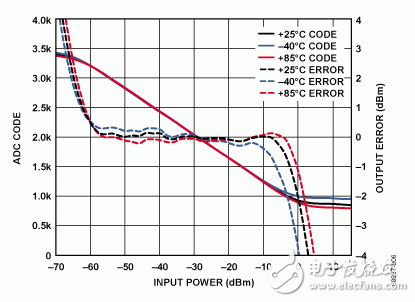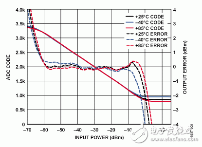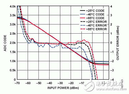 图3至图8显示一个RF功率测量系统使用AD8318和 AD7887BR所能获得的系统性能。图中曲线反映的是RF输入功率(dBm)与ADC输出码和输出误差(dBm)的关系。生成这些曲线所用的数据是在各种输入功率电平、频率、温度以及使用ADC内部或外部基准电压源下测得的。从这些图还可以看出:当ADC使用低漂移外部基准电压源时,可以提高系统性能并降低温度所引起的漂移。关于使用外部基准电压源的更多详细信息,请参阅“常见变化”部分。