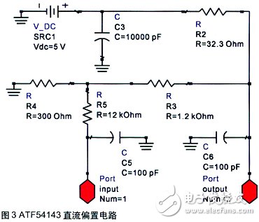 直流偏置电路为放大器提供合适的电压和电流,使得晶体管工作于要求的静态工作点,并在晶体管参数和温度变化的范围内,保持静态工作点的恒定。根据器件特性选择最佳条件,这里选取ATF54143的典型直流工作点参数:VDS=3V,ID=60mA;偏置的方式采用了电阻偏置,它有较好的温度稳定性。结合上述偏置电路的设计原则和ATF54143的S参数数据,就可设计出如图3所示的直流偏置电路。