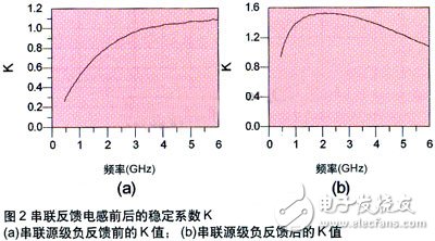 接入源极负反馈后,对ATF54143进行仿真。图2即为晶体管稳定性改善前后的仿真结果图,(a)是末接入源极负反馈时,晶体管在小于3.5GHz的频段内都是不稳定的;(b)是接入源极电感后,ATF54143在1.9GHz~2.1GHz频段范围内都是稳定的。可见采用源极串联负反馈技术后,稳定性因子K在所要求的频率范围内大于1,满足绝对稳定的条件要求。
