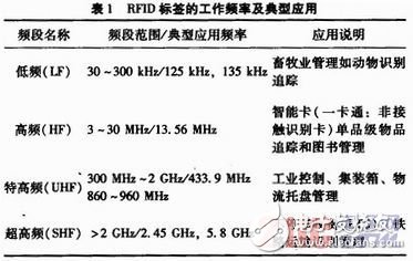 典型的RFID 系统一般由阅读器、电子标签、RFID 中间件及应用软件系统3 部分组成。阅读器与标签建立双向通信,通常由射频接口、逻辑控制单元和天线3 部分组成; 标签用于存储所标识物品的身份和属性信息,属于被识别物品的标识设备,通常附着在被识别物品表面或内部,是RFID 系统的电子数据载体,由MCU、耦合线圈、整流滤波电路和自耦变压器构成; 阅读器能够在读取信息后将现存的被标识物品的信息通告给另一个系统,这个系统通常运行一种软件,该软件在阅读器和应用层面之间,通常被称为RFID 中间件。中间件是连接RFID设备和企业应用程序的纽带,也是RFID 系统的核心,中间件将基于不同平台、不同需求的应用环境与RFID 物理设备连接起来,并提供合适的接口使之能够进行数据交换。根据RFID 系统中射频信号耦合方式的不同可分为电感耦合和电磁反向散射耦合方式,电感耦合方式一般适合于中、低频工作的近距离射频识别系统。电磁反向散射耦合方式一般适合于特高频、超高频工作的长距离射频识别系统,具体应用如表1 所示。