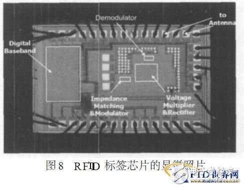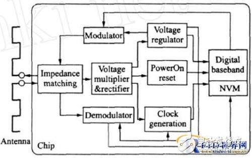 图1所示为RFID标签系统的结构框图,芯片包含射频模拟前端、数字基带和非易失性存储器(NVM)三部分,其中射频?模拟前端基本功能模块包括:阻抗匹配、倍压整流、调制、解调、稳压、上电复位、时钟产生等。