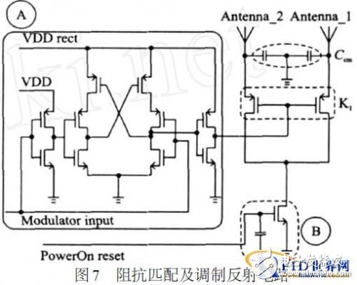 阻抗匹配网络由电容Ccm和开关K1两部分组成,如图7所示。为了保证两个天线引脚间电路的对称,Ccm采用两个电容并联的形式,每个大小为170fF;K1由两个PMOS开关管组成,PMOS由基带信号经过电平转换电路(图7中A部分)后驱动,因此PMOS的栅极可以获得更高的栅压,保证关断状态可靠截止;B部分为上电保护电路,保证数字基带给出的上电复位信号处在稳定状态下芯片才能进入调制反射,避免了由于数字基带电路复位前状态不确定而导致芯片在无法获得工作能量的情况下反射。PMOS开关管和NMOS上电保护管均采用网状栅极结构,增大MOS管的宽长比,有利于减小MOS管的电阻和寄生电容。