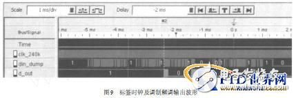 使用Impinj公司的speedway读写器,设置发送功率为2WERP,标签天线增益115dBi,在自由空间中进行测试。使用安捷伦1682A逻辑分析仪测试信号波形如图9,图中“clk-240k”为系统工作时钟,频率为240kHz;“din-dump”为解调输出信号;“d-out”为调制输出信号。测试表明,采用该阻抗匹配网络的标签在和读写器通信的过程中,误码率低于10-4,标签的一次识别更为准确。