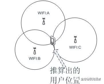WiFi定位一般采用“近邻法”判断,即最靠近哪个热点或基站,即认为处在什么位置,如附近有多个信源,则可以通过交叉定位(三边定位),提高定位精度。