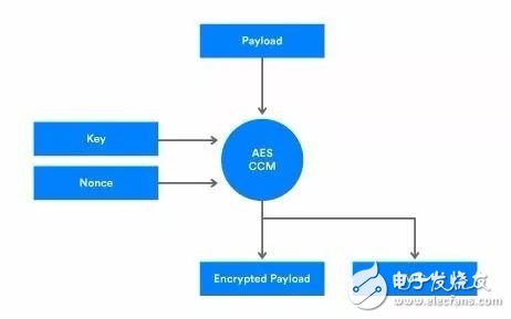 图2显示了可以来自蓝牙网状网络层或上层传输层的明文有效载荷,由具有输入加密密钥,随机数和明文有效载荷的AES-CCM处理。输出加密的有效载荷和MIC。