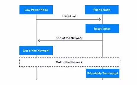 · 如果没有Friend poll,Friend Subscription List Add或Friend Subscription List Remove消息在PollTimeout计时器到期之前由Friend节点收到,Friendship终止。