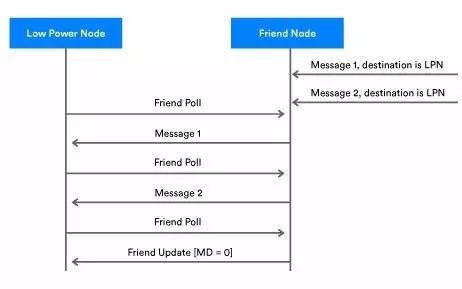 · 定期地,LPN使其收发器发送一个Friend Poll到Friend节点,要求为它存储任何缓冲的消息。
