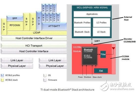 大多数堆栈都是为特定主机而开发的,当凭借Bluetooth进行创造、开发和创新时,极大地限制了人们才能的发挥。要启动一个Bluetooth项目需购买全新的微控制器(MCU);为使用新型MCU进行工作需花费时间学习;此外还得受限于该MCU的能力。TI双模Bluetooth堆栈可为所有最终用户提供完全的灵活性。该软件能与所有CC256x器件(CC2560、CC2564和CC2564MODN)一起工作,提供经典和低能耗的Bluetooth配置文件。但真正使该堆栈与众不同的是:它能与广泛系列的MCU协同工作,从而允许用户选择他们最喜欢的微控制器或最适合他们项目的微控制器。TI双模Bluetooth堆栈提供了三种软件开发堆栈:我们的超低功耗MSP430™ MCU、TM4C MCU以及STM32F4 MCU。这些开发堆栈不仅可提供范例应用,而且经配置还能与多种多样的MCU配套使用。