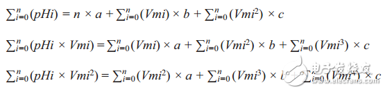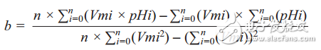 若有多组点,为提高精度,可使用一阶线性回归。给定n个数据点P0 (Vm0, pH0)、P1 (Vm1, pH1)、P2 (Vm2, pH2)、P3 (Vm3, pH3)、…、Pn (Vmn, pHn),可以利用最小二乘法建立一般方程pHx = a + b ×Vmx,其中b为直线的斜率,a为截距,其值如下: