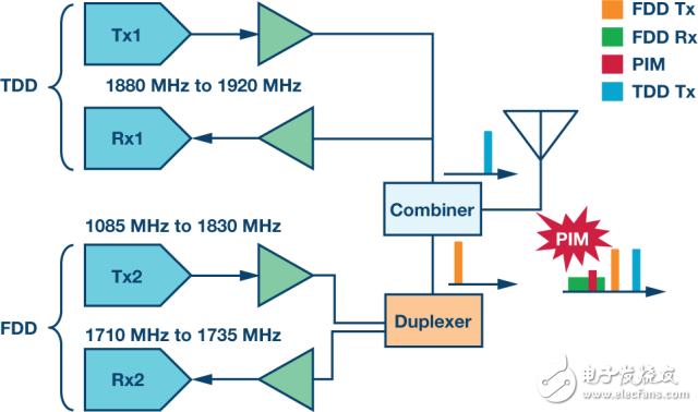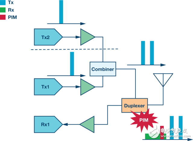 图5显示了这种配置的概貌。在这个例子中,客户试图实现一个复杂但现实的配置。一个分支是TDD双频,另一分支是FDD单频,采用一个双工器。信号汇合起来,共享单根天线。Tx1和Tx2信号之间的无源交调发生在来自合并器的路径中、到天线的传输线路中以及天线本身中。所得的交调伪像落回到FDD接收机频段Rx2。