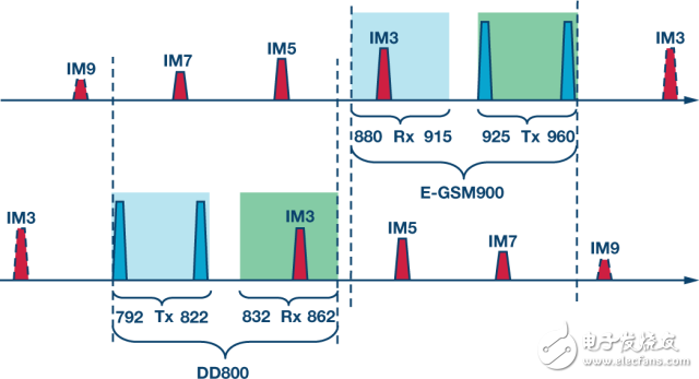 图6所示为对一个双频系统的实际分析。注意在这个例子中,我们需要考虑三阶以上的无源调制伪像。这种情况下,重点关注从一个频段(内部)落回到另一个接收机频段内的交调伪像。