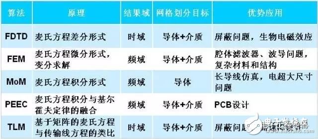 在无法满足电小尺寸时,难以使用集总参数解决问题,就必须使用场论!然而,用麦大神的方法怎样都不如基大神(基尔霍夫)的解法来得舒服,各路小神们看不下眼,基于麦大神的理论,用数值算法代替数学解析式,从而用电脑把人脑解放出来,解决民间疾苦。于是,就有了我们现在熟得不能再熟的矩量法(MoM)、时域有限差分(FDTD)法、有限元法(FEM)、传输线矩阵法(TLM)和部分元等效电路(PEEC)等全波算法。现有的全波仿真商业软件没有跑出这些算法的圈子,因此了解了这些算法的特性,也就知道如何选用恰当的商业仿真软件: