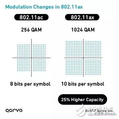 • 调制:802.11ax 拥有更高的调制方案,从 256 QAM 升级至 1024 QAM,这样可以达到更高的吞吐量,将容量提高 25%,每个符号传输 10 位数据。
