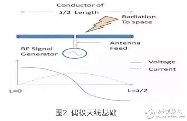如图2所示,导体的波长为λ/2,其中λ为电信号的波长。信号发生器通过一根传输线(也称为天线馈电)在天线的中心点为其供电。按照这个长度,将在整个导线上形成电压和电流驻波,如图2所示。输入到天线的电能被转换为电磁辐射,并以相应的频率辐射到空中。该天线由天线馈电供电,馈电的特性阻抗为50Ω,并且辐射到特性阻抗为377Ω的空间中。因此,对于天线的几何形状,有两个非常重要的事项需要注意:a.天线长度b.天线馈电
