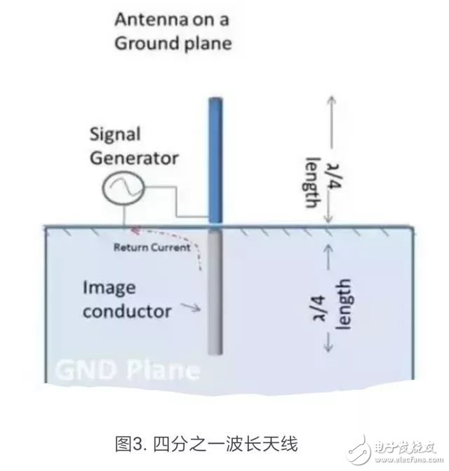 长度为λ/2的天线(如图2所示)被称为偶极天线。但在印刷电路板中,大多作为天线使用的导体长度仅为λ/4,但仍具有相同的性能。请参见图3。通过在导体下方一定距离的位置上放置接地层,可以创建与导体长度相同的镜像(λ/4)。被组合在一起时,这些引脚作为偶极天线使用。这种天线被称为四分之一波长(λ/4)天线。PCB上几乎所有的天线都按铜制接地层上四分之一波长的尺寸实现。请注意,该信号现在是单端馈电,同时接地层作为返回路径使用。